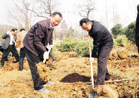 上午10時(shí)許,一到植樹(shù)現場(chǎng),周春雨、白金明、何金良、顧世平、方志宏等市幾大班子領(lǐng)導就迅速融入到植樹(shù)勞動(dòng)的大軍之中。他們興致勃勃地拿起鐵鍬,同在場(chǎng)的干部一起揮鍬挖土,將一棵棵樹(shù)苗植入樹(shù)坑,培土,澆灌,每道工序都做得十分認真。市委書(shū)記周春雨、市長(cháng)白金明一邊植樹(shù),一邊與市林業(yè)局、住建委負責同志交談,了解全市植樹(shù)造林及“綠滿(mǎn)珠城”工作開(kāi)展情況。經(jīng)過(guò)一番緊張勞動(dòng),300多棵桂花、櫻花等樹(shù)木昂然挺立,在和煦的春光中綻放蓬勃生機。