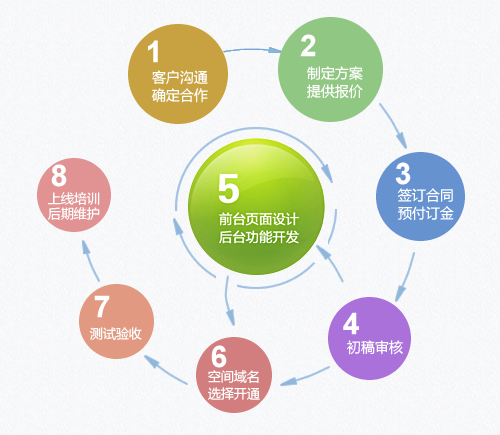網(wǎng)站建設流程概述:客戶(hù)溝通,確定合作意向→制定建設方案,提供報價(jià)→簽訂合同,預付定金→初稿審核→前臺頁(yè)面設計,后臺程序開(kāi)發(fā)→空間及域名選擇、開(kāi)通→測試驗收→上線(xiàn)培訓,后期維護