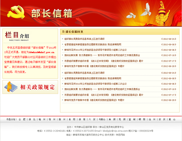 中共五河縣委組織部“部長(cháng)信箱”于2012年2月正式開(kāi)通,地址為bbwhzzb@ahxf.gov.cn。歡迎廣大黨員干部群眾對五河縣組織工作提出寶貴意見(jiàn)和建議,通過(guò)電子郵件發(fā)至“部長(cháng)信箱”,我們將安排專(zhuān)人認真瀏覽,及時(shí)呈報部長(cháng)批閱,盡力回復。